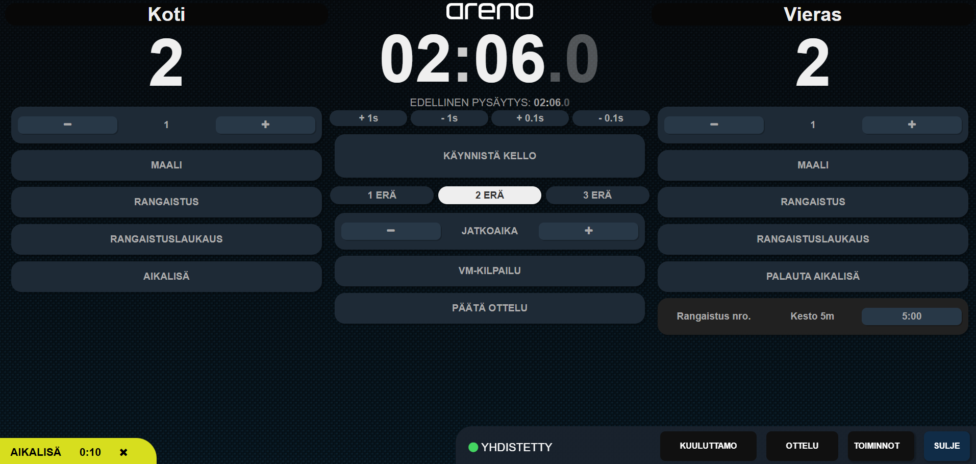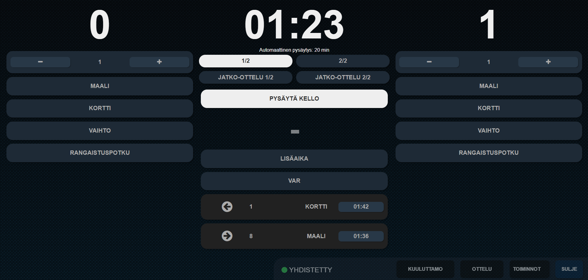 Areno-tulostauluohjelmisto skaalautuu pienistä saleista liigatason areenoihin ja ulkostadioneihin. Yhdellä käyttöliittymällä pidät tuloksen ja kellot aina näkyvissä, samalla kun ohjaat lajikohtaiset grafiikat ja tehosteet. Toimitamme ja räätälöimme halutessasi koko paketin toiveidesi mukaan — ohjelmiston lisäksi meiltä saa LED-näytöt, ohjaimet, asennuksen ja tuen — eli saat kaiken yhdeltä kumppanilta. Mitoitamme ratkaisun aina lajiin, tilaan ja budjettiin sopivaksi, sisä- ja ulkokäyttöön, pienistä saleista liigahalleihin ja ulkostadioneille. Alta löydät muutamia esimerkkejä toimittamistamme näyttöratkaisuista.